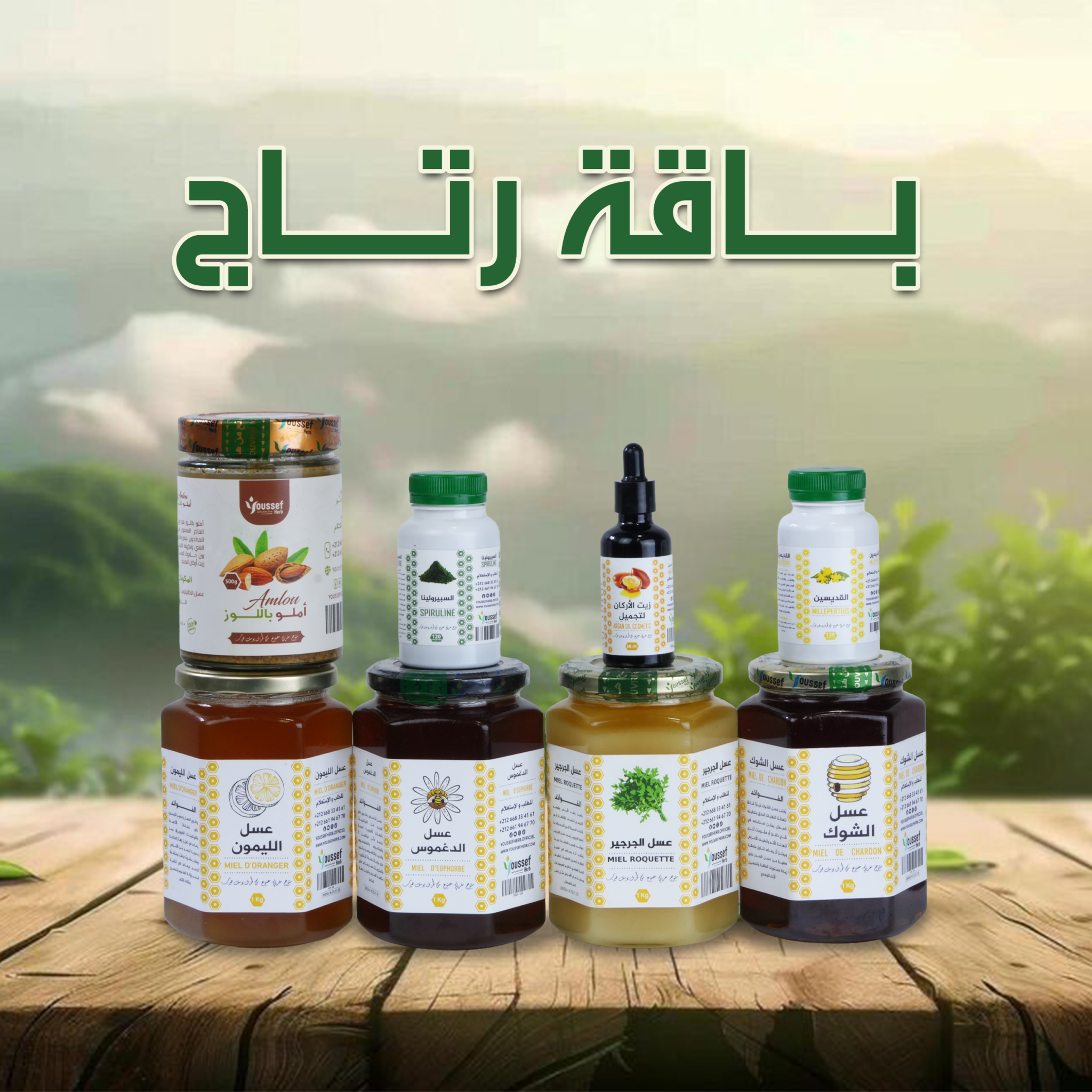 باقة فاخرة تم إعدادها بعناية لتجمع بين مجموعة مختارة من أجود أنواع العسل الطبيعي، أملو باللوز التقليدي، عشبة القديسين، السبيرولين الطبيعي، وزيت الأركان التجميلي الأصلي. تركيبة متكاملة تهدف إلى دعم الصحة العامة، تعزيز الطاقة والحيوية، والمساهمة في العناية بالبشرة والشعر بطريقة طبيعية وآمنة.