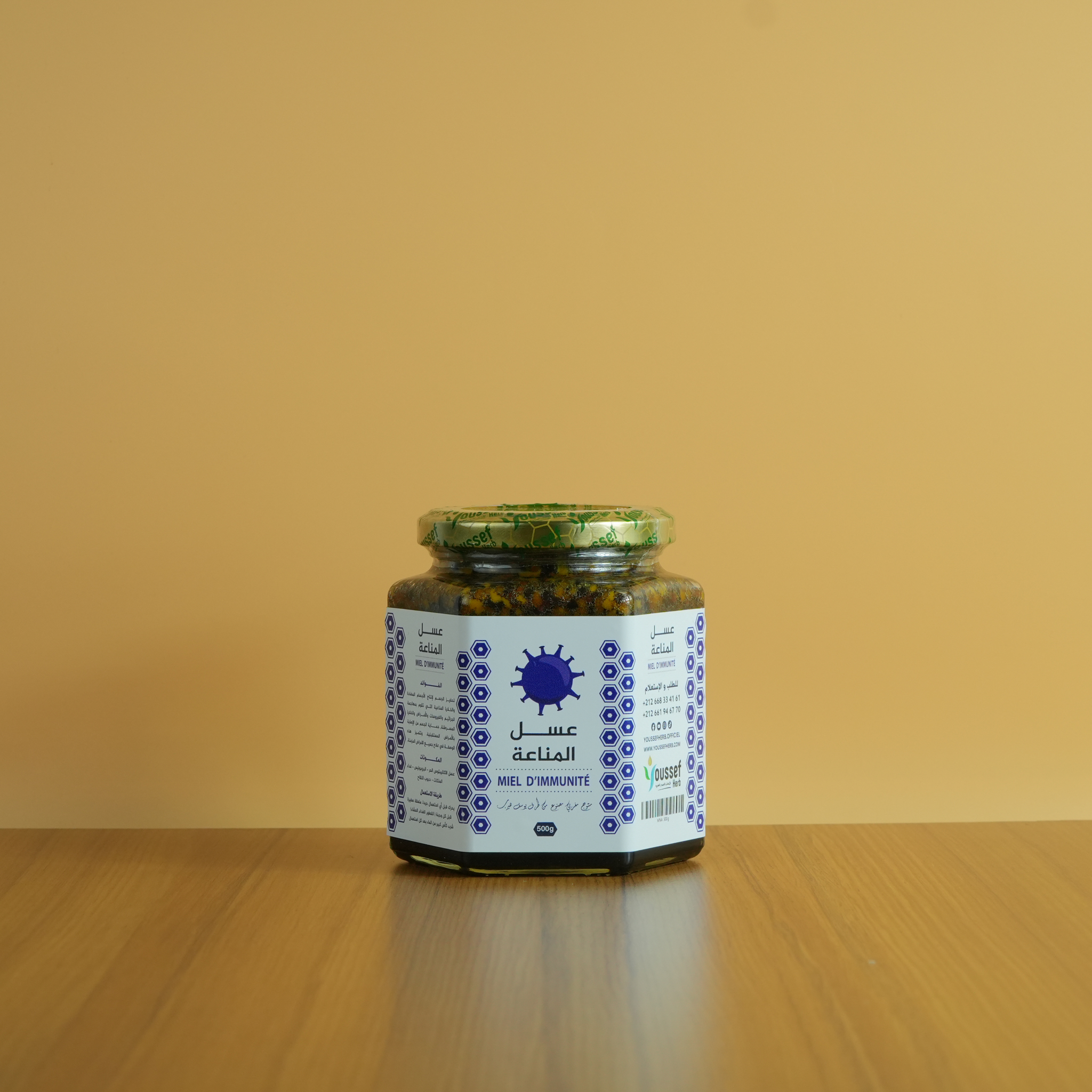 عسل المناعة هو منتج طبيعي قيم يتميز بخصائصه المميزة والفعالة في تعزيز جهاز المناعة للجسم. يتم إنتاجه من خلال جمع رحيق النحل من مصادر نباتية متنوعة مثل الأزهار والأعشاب البرية، ويتميز بتركيبته الفريدة التي تحتوي على مجموعة واسعة من المواد الغذائية والعناصر الطبيعية المفيدة. يعتبر مصدرا غنيا بالفيتامينات والمعادن مثل الفيتامينات C و E والزنك والحديد والكالسيوم والبوتاسيوم والمغنيسيوم، وهذه العناصر الغذائية الأساسية تعمل على دعم وتعزيز وظائف جهاز المناعة.تتميز خصائصه بقدرته على مكافحة الجراثيم والبكتيريا والفيروسات، مما يجعله تحصينا فعالا ضد العديد من الأمراض والالتهابات. بفضل خصائصه المضادة للميكروبات، يستخدم في علاج العديد من الحالات الصحية، بما في ذلك نزلات البرد والإنفلونزا والتهابات الحلق والتهابات الجهاز التنفسي العلوي، ويساعد في تخفيف الأعراض وتسريع عملية الشفاء.بالإضافة إلى فوائده الصحية، يعتبر عسل المناعة مصدرا طبيعيا للطاقة والقوة، حيث يمنح الجسم النشاط والحيوية. كما يعتبر مضادا فعالا للأكسدة.بشكل عام، يعتبر عسل المناعة إضافة قيمة لأسلوب حياة صحي، حيث يمنح الجسم الحماية اللازمة ضد الأمراض ويعزز الصحة والعافية العامة. استخدامه بانتظام يمكن أن يساهم في تحسين جودة الحياة والمساهمة في الحفاظ على صحة الجسم وقوته ونشاطه